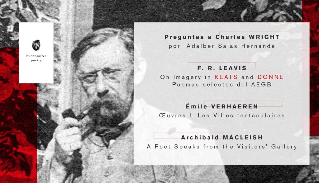 pipa passes octubre 11, 2016 Buenos Aires Poetry n°6, Charles Wright Buenos Aires Poetry (11-10 al 17-10) – Preguntas a Charles WRIGHT – por Adalber Salas Hernández F. R. Leavis [On Imagery in Keats and Donne] Émile Verhaeren – Œuvres I, Les Villes tentaculaires Archibald MacLeish – A Poet Speaks from the Visitors’ Gallery – – Comparte esto: Haz clic para compartir en X (Se abre en una ventana nueva) X Haz clic para enviar un enlace por correo electrónico a un amigo (Se abre en una ventana nueva) Correo electrónico Haz clic para compartir en Reddit (Se abre en una ventana nueva) Reddit Haz clic para compartir en Facebook (Se abre en una ventana nueva) Facebook Me gusta Cargando... Relacionado
