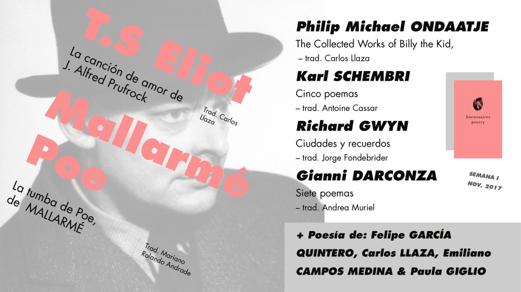 pipa passes octubre 30, 2017 Buenos Aires Poetry BUENOS AIRES POETRY – SEMANA I, NOVIEMBRE, 2017 * La canción de amor de J. Alfred Prufrock, de T. S. ELIOT – trad. Carlos Llaza * La tumba de Edgar Poe, de Stéphane MALLARMÉ – trad. Mariano Rolando Andrade * The Collected Works of Billy the Kid, de Philip Michael ONDAATJE – trad. Carlos Llaza * Cinco poemas, de Karl SCHEMBRI – trad. Antoine Cassar * Ciudades y recuerdos, de Richard GWYN – trad. Jorge Fondebrider * Siete poemas, de Gianni DARCONZA – trad. Andrea Muriel * Poesía: Felipe García Quintero, Carlos Llaza, Emiliano Campos Medina & Paula Giglio Comparte esto: Haz clic para compartir en X (Se abre en una ventana nueva) X Haz clic para enviar un enlace por correo electrónico a un amigo (Se abre en una ventana nueva) Correo electrónico Haz clic para compartir en Reddit (Se abre en una ventana nueva) Reddit Haz clic para compartir en Facebook (Se abre en una ventana nueva) Facebook Me gusta Cargando... Relacionado
