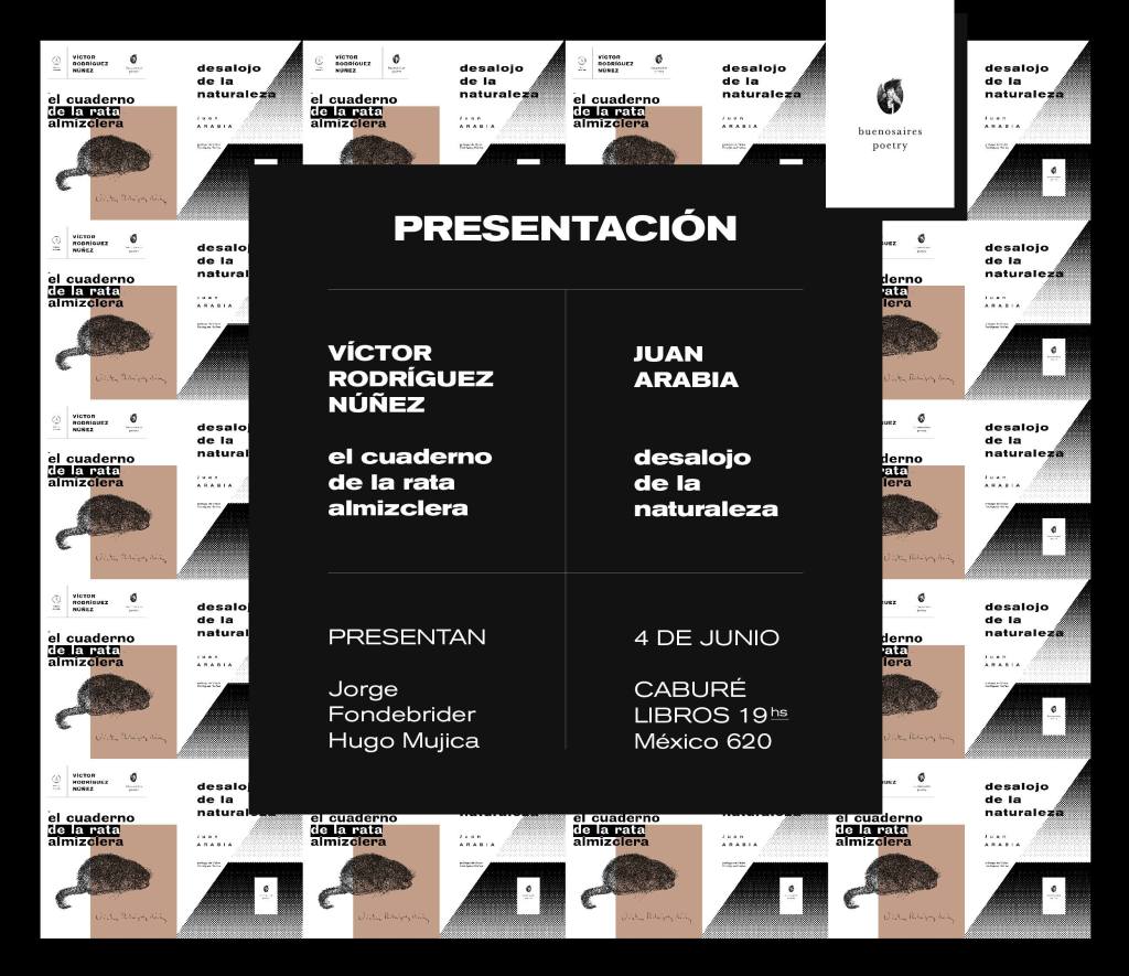 El lunes 4 de junio a las 19 hs., se presentarán los libros publicados por Buenos Aires Poetry «el cuaderno de la rata almizclera» de Víctor Rodríguez Núnez y «desalojo de la naturaleza» de Juan Arabia, junto a los poetas Jorge Fondebrider y Hugo Mujica en Caburé Libros (México 620, San Telmo, Ciudad Autónoma de Buenos Aires).