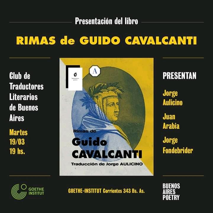 La editorial Buenos Aires Poetry presenta su edición bilingüe de las Rimas, del poeta Guido Cavalcanti (1255-1300), en traducción de Jorge Aulicino (también traductor de la Divina Comedia, de Dante Alighieri). El interés de los poetas contemporáneos por Guido Cavalcanti se debe principalmente a Ezra Pound, quien ha sido algo así como una puerta de acceso para acceder a la compleja obra del más virtuoso representante del llamado dolce stil nuovo, denominación dada a un grupo de poetas italianos de la segunda mitad del siglo XIII, integrado por Guido Guinizelli, Lapo Gianni, Cino da Pistoia, Dino Frescobaldi, Guianni Alfani y los nombrados Dante y Cavalcanti, acaso los más importantes. Sobre éstas y otras cuestiones conversarán en la presentación Juan Arabia, director editorial de Buenos Aires Poetry, y Jorge Aulicino, poeta y traductor.