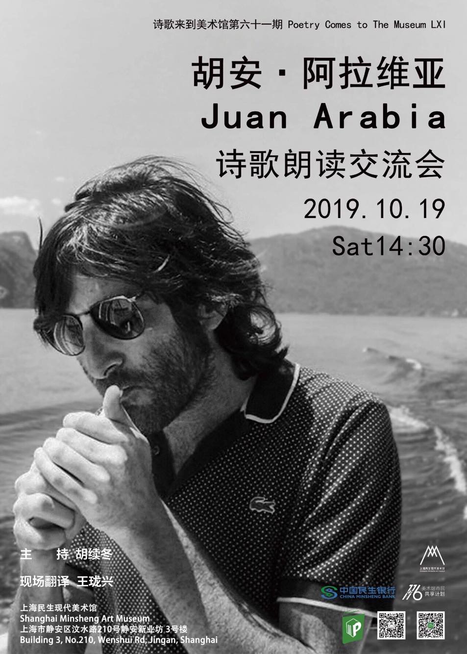 Poeta: Juan Arabia / Anfitrión: 胡续冬 / Planificación: 王寅 (Wang Yin) / Traducción: 王珑兴 / Día y horario: 19 de octubre de 2019 | Sábado 14: 30-16: 30 / Lugar: Museo de Arte Moderno de Shanghai Minsheng | (Edificio 3, Jing’an Xinyefang, 210 Wenshui Road, distrito de Jing’an)