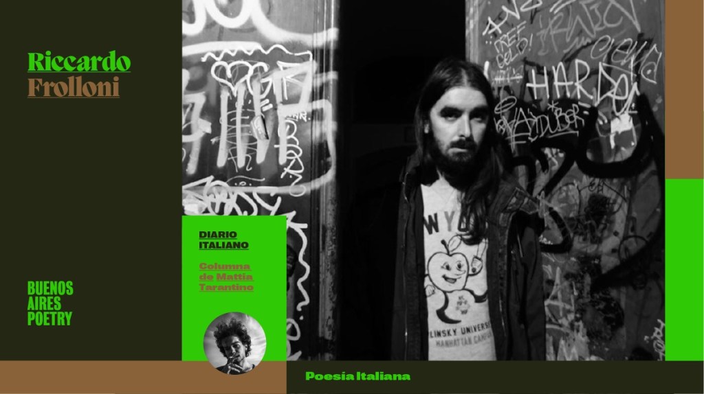 Riccardo Frolloni (Macerata, 1993) es poeta y licenciado con honores en Estudios Italianos. Publicó su primera colección de poemas Languide instantanee Polaroid (Affinity Elective Editions, ganador del premio «Le Stanze del Tempo» 2014 y finalista del «Elena Premio Violani-Landi «2015). Tradujo el último libro del canadiense Richard Harrison y varios otros autores como Ron Padgett y Frank O’Hara. De 2018 a 2020 fue director del Centro de Poesía Contemporánea de la Universidad de Bolonia.