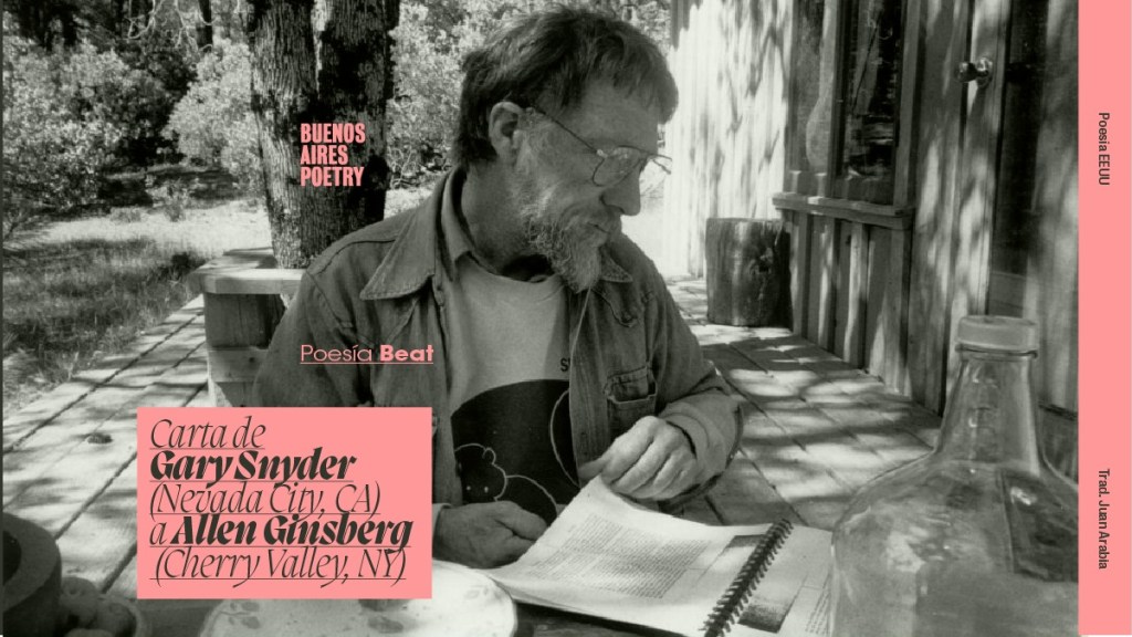 Una de las relaciones centrales en la escena Beat fue la duradera amistad de Allen Ginsberg y Gary Snyder. Ginsberg presentó a Snyder a los escritores de East Coast Beat, incluido Jack Kerouac, mientras que el propio Snyder se convirtió en el modelo del poeta serio en el que Ginsberg tanto quería convertirse. Snyder alentó a Ginsberg a explorar la belleza de la costa oeste y, de manera aún más duradera, le presentó el budismo a Ginsberg, el tema de tantos largos intercambios de cartas entre ellos.