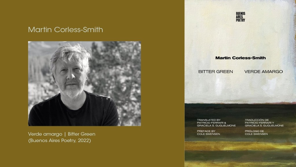 Martin Corless-Smith es poeta, traductor literario, ensayista y pintor. Nació y se crió en Worcestershire (West Midlands), Inglaterra. Estudió pintura en la University of Reading antes de viajar a los Estados Unidos en 1989 donde continuó sus estudios plásticos recibiendo un Master of Fine Arts en Arte de la Southern Methodist University de Dallas, Texas. A partir de 1993 comenzó formalmente sus estudios literarios recibiendo un MFA en Poesía de la University of Iowa y un Doctorado en Escritura Creativa & Literatura Inglesa de la University of Utah. Autor de numerosos títulos, sus libros de poesía más recientes incluyen Bitter Green [Verde amargo] (Fence Books, 2015), The Fool & The Bee [El bobo y la abeja] (Shearsman Books, 2019), The Melancholy of Anatomy [La melancolía de la anatomía] (Shearsman Books, 2021) y The Ongoing Mystery of the Disappearing Self [El misterio continuo del yo que desaparece] (SplitLevel Texts, 2021). Entre sus traducciones se destaca Odious Horizons: Some Versions of Horace [Horizontes odiosos: algunas versiones de Horacio] (Miami University Press, 2019). Es también autor de la novela This Fatal Looking Glass [Este espejo fatal] (SplitLevel Texts, 2015) y de la colección de ensayos The Poet’s Tomb [La tumba del poeta] (Parlor Press, 2020). Es profesor de Escritura Creativa en Boise University donde fundó el sello Free Poetry, publicando folletos de tamaño de bolsillo desde 2006 y libros a partir de 2020. Desde hace más de dos décadas reside en Boise, Idaho, en el noroeste de los Estados Unidos. Bitter Green es su primer libro traducido al español.