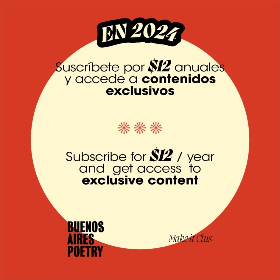 By subscribing YEARLY for only 12 dollars, you can have access to the archive of poetry translations and critical texts, which is renewed weekly. You can cancel your subscription at any time. By subscribing, you help Buenos Aires Poetry to keep relevant and independent.