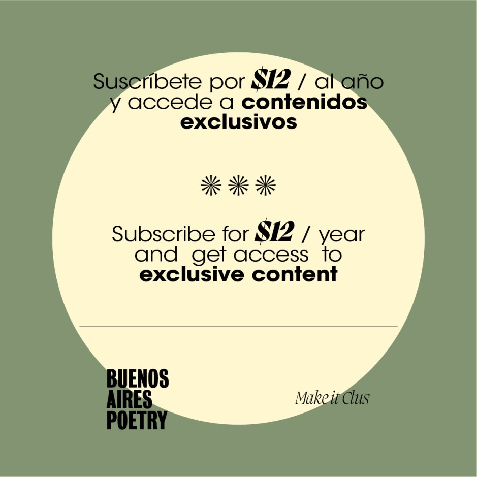 By subscribing YEARLY for only 12 dollars, you can have access to the archive of poetry translations and critical texts, which is renewed weekly. You can cancel your subscription at any time. By subscribing, you help Buenos Aires Poetry to keep relevant and independent.