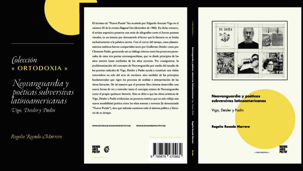 En este punto tenemos que mencionar que a lo largo de la presente investigación empleamos tanto la crítica literaria como las teorías provenientes de las artes plásticas. Esta decisión se debe a que varias de las obras radicales de Vigo, Deisler y Padín no pueden analizarse e interpretarse de una manera convencional; al fin y al cabo, el proyecto de la “Nueva Poesía” busca desestabilizar, desde todos los ángulos posibles, el sistema literario reinante. Por tal motivo, para lograr un mejor acercamiento al fenómeno estético, hemos optado por emplear determinadas herramientas y conceptos derivados de las artes plásticas (como puede ser el color, la composición, los signos gráficos, etc.). A su vez, esta decisión también resulta ser pertinente para los fines primarios del libro, ya que nos permite ampliar los horizontes de lectura y desarrollar así una visión multidisciplinar del acto poético.