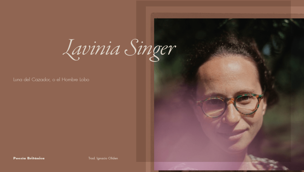 Lavinia Singer es la autora del panfleto Ornaments: A Handbook (If a Leaf Falls/Glyph Press, 2020) y coeditora de Try To Be Better (Prototype, 2019), un acercamiento creativo-crítico a la obra de W. S. Graham. Su primera colección completa de poesía, Artifice, fue publicada por Prototype en 2023. Lavinia fue editora de Oxford Poetry y trabajó en Enitharmon Press de 2013 a 2016. Actualmente es editora de poesía en Faber.