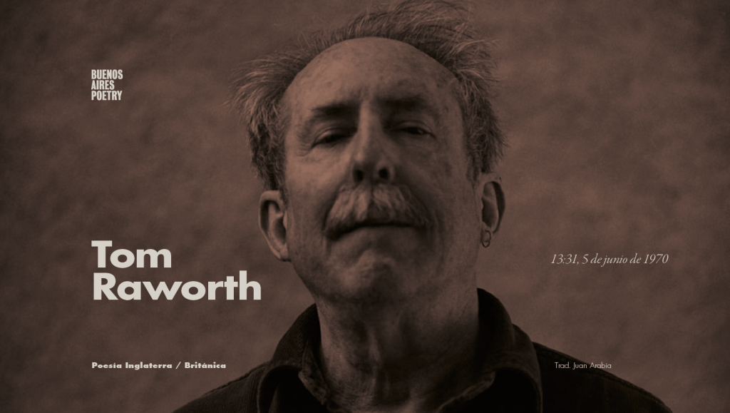 Tom Raworth (1938, Bexleyheath, Reino Unido — 2017, Londres, Reino Unido) ha publicado desde 1966 más de cuarenta libros y cuadernillos de poesías, prosa y traducciones (Huidobro, Vallejo, Parra, entre otros). Se le considera parte de la llamada British Poetry Revival de los 60s y 70s, que reunía a poetas de inclinación modernista. Su trabajo gráfico ha sido exhibido en Francia, Italia y EEUU, y ha colaborado con músicos, pintores y poetas. Es considerado uno de los mejores poetas británicos de la actualidad (opinión compartida por autores y académicos desde Charles Olson, y R. Creeley, hasta Marjorie Perloff, Ch. Bernstein, y Eric Mottram, por nombrar algunos). Su poesía es rápida, sorpresiva, en permanente movimiento.