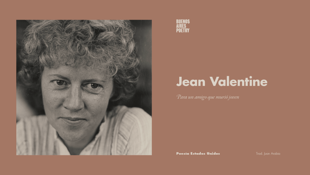 Jean Valentine (1934–2020) nació en Chicago y obtuvo su licenciatura en Radcliffe College. Su primer libro de poemas, Dream Barker and Other Poems, ganó el premio Yale Series of Younger Poets Award en 1965. Es autora de más de una docena de colecciones de poesía, entre ellas The River at Wolf (1992); Door in the Mountain: New and Collected Poems, 1965–2003, que ganó el Premio Nacional del Libro; Break the Glass (2010), finalista del Premio Pulitzer; y Shirt in Heaven (2015).