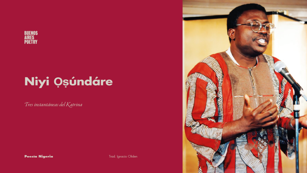 Niyi Ọ̀ṣúndáre (Ìkẹ́rẹ́-Èkìtì, Nigeria, 1947) poeta, dramaturgo, ensayista, e investigador académico. Su obra incluye los libros Songs of the Marketplace (1983), Village Voices (1984), Waiting Laughters (1990), Days (2007), y City Without People: the Katrina Poems (2011). Entre sus numerosos premios se encuentran el Premio Tchicaya U Tam’si de Poesía Africana. Fue profesor durante veinticuatro años en la Universidad de Nueva Orleans.