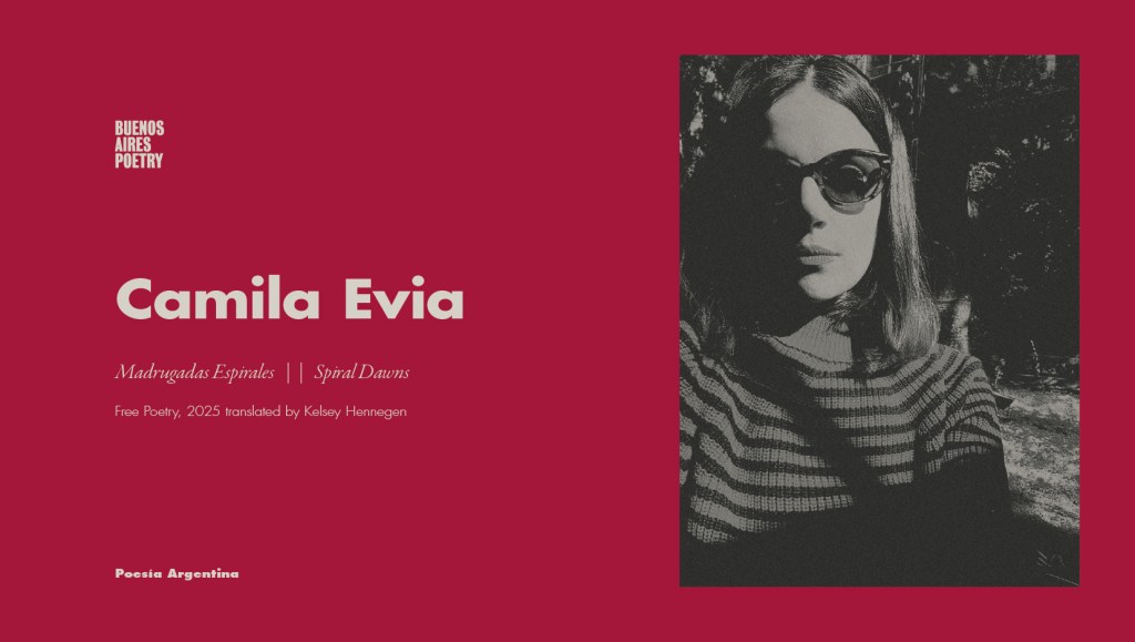 Camila Evia (San Martín de los Andes, Argentina, 1987) is a poet, graphic designer and translator. Evia graduated from the Faculty of Architecture, Design and Urbanism of the University of Buenos Aires (UBA). She is the Art Director of Buenos Aires Poetry, where she is working with editorial design as well as editing and translation. Her artwork was exhibited in several media forms in Argentina, Latin America, United States (Print Magazine) and Italy. Her poems have been published in magazines from all around the world. She has published the books Ridículos (Buenos Aires Poetry, 2019) and Mina Loy: Poemas escogidos + Feminist manifesto (Buenos Aires Poetry, 2020), which counts with an extended edition published in 2021.