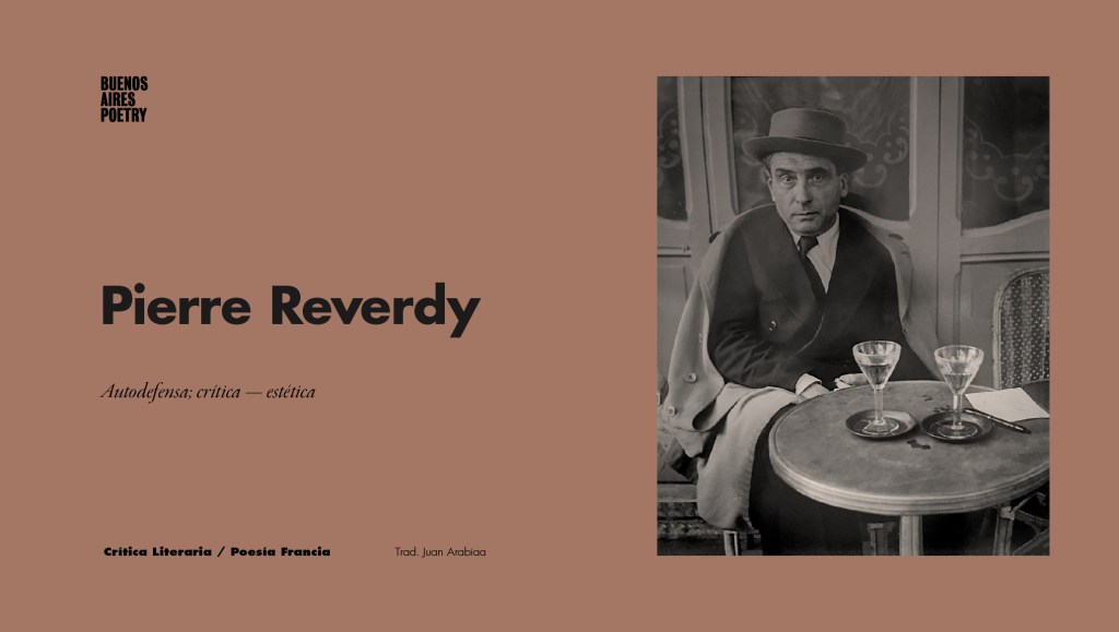 Pierre Reverdy (1889, Narbona — 1960, Solesmes) fue un poeta y moralista francés que reflejó primero la influencia cubista y luego la surrealista. La dificultad de sus poemas limitó su público. Fundó una revista de corta duración, Nord-Sud (1916), para promover el cubismo. Tras inclinarse por el surrealismo en la década de 1920, retomó las técnicas poéticas de inspiración cubista. Reverdy publicó Étoiles peintes (1921), Les Épaves du ciel (1924) y Flaques de verre (1929). En 1926 se retiró a la Abadía de Solesmes, donde permaneció hasta su muerte. En soledad se dedicó a la búsqueda del significado espiritual del mundo físico, expresando esta vocación en las disciplinadas máximas de Le Gant de crin (1927) y Le Livre de mon bord (1948).