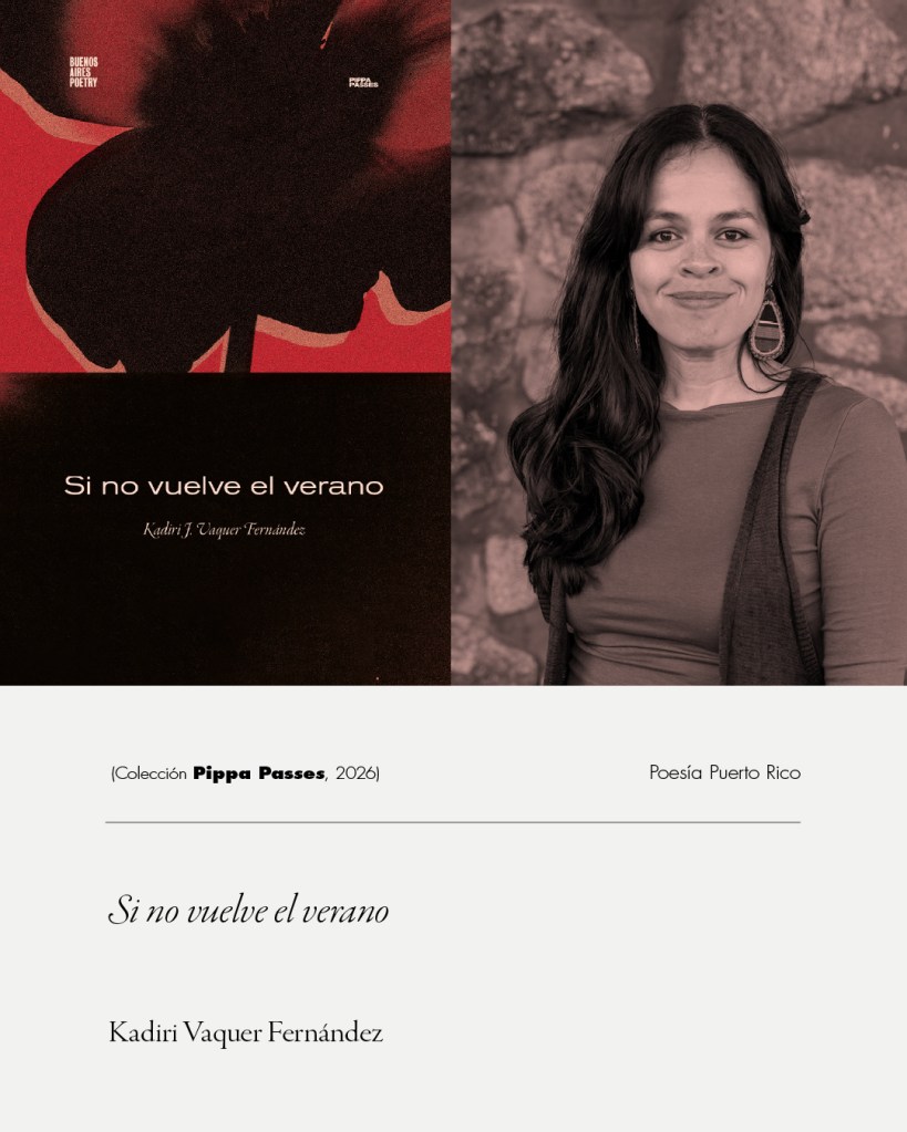 Kadiri Vaquer Fernández (Puerto Rico) es poeta, traductora y profesora de lengua, literatura y cultura en Monterey, California. Su primer poemario, Andamiaje, fue publicado por Ediciones Callejón (2012) y el segundo, Ritos de pasaje, por La Secta de los Perros (2019). Sus poemas han sido publicados en revistas y antologías como Arc Poetry, The Puerto Rico Review, 80 Grados, Cantera, Claridad, Furman 217, In My Secret Life, etc. Ha sido traducida al inglés, francés e italiano. Entre sus traducciones se encuentran la antología de literatura dominicana, Literary Works by 10 Dominican Women y el poemario All That Was Future de Iliana Pichardo Urrutia.