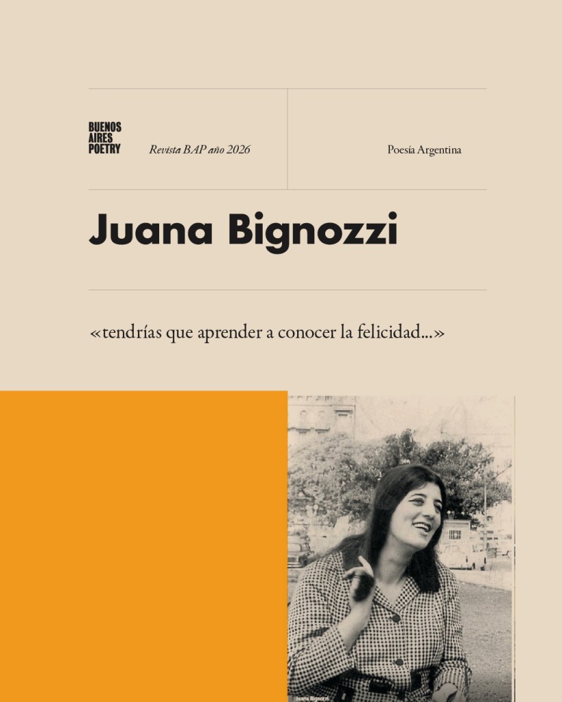 Juana Bignozzi (1937-2015) fue una poeta, periodista y traductora argentina. Una juventud militante y la convicción de que la hipotética llegada de los Montoneros al poder no podía traer nada bueno, la llevó, luego de haberse convertido en un ícono de la poesía de la década de 1960, a residir en Barcelona desde 1974 a 2004. Allí trabajó como traductora del francés y el italiano, ocupándose fundamentalmente de historia del arte y filosofía. Sus libros de poemas incluyen Los límites (1960), Tierra de nadie (1962), Mujer de cierto orden (1967), Regreso a la patria (1989), Interior con poeta (1994), Partida de las grandes líneas (1996), La ley tu ley (2000, obra reunida), Quién hubiera sido pintada (2001), Antología personal (2009), si alguien tiene que ser después (2010) y Los poetas visitan a Andrea del Sarto (2014).