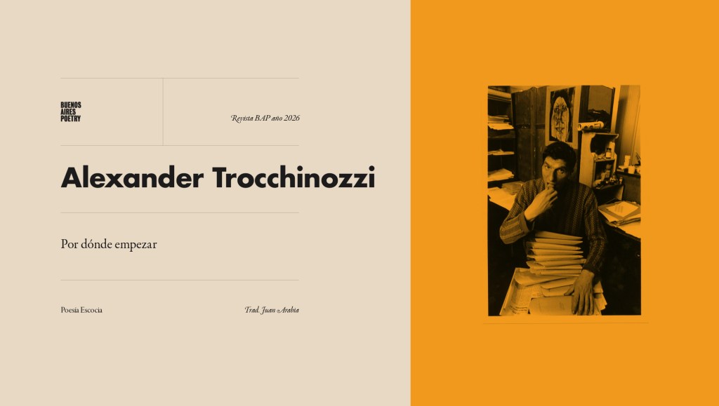 Alexander Trocchi (1925-1984), fue un novelista y poeta escocés. Figura mítica, llamado el «Burroughs escocés», nació en Glasgow, vivió en París en los años 50 donde fundó la revista Merlin, colaboró y publicó en Olympia Press y fue amigo de Guy Debord y miembro de la Internacional Situacionista. Luego residió unos años en Estados Unidos y en 1961 regresó a su país. En poesía publicó Man at Leisure (John Calder, London, 1972).