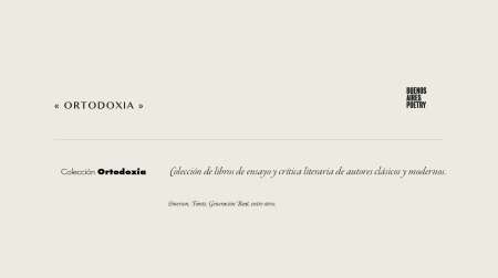 Ortodoxia Ortodoxia: Colección de libros de ensayo y crítica literaria, de autores clásicos (Emerson, Generación Beat) y modernos.